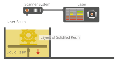 SLA is a laser-based process that works with photopolymer resins that react with the laser and cure to form a solid in a very precise way. A laser beam is directed in the X-Y axes across the surface of the resin according to the 3D data supplied to the machine (the .stl file), whereby the resin hardens precisely where the laser hits the surface. Once the layer is completed, the platform within the vat drops down by a fraction (in the Z axis) and the subsequent layer is traced out by the laser. This continues until the entire object is completed and the platform can be raised out of the vat for removal.
