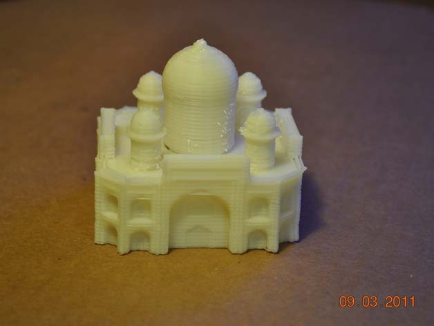 DOWNLOADSummaryThis is a simplified miniature Taj Mahal. I recommend using the latest version of the .stl file: taj_mahal_110903e_ctr.stl. I modified the design to reduce thermal warping and use about 15% less plastic. I could not get the original file to print properly on my older cupcake due to thermal warping. The picture shows the ...110903e file printed at 80% size. It printed in 2 hours and 2 min.