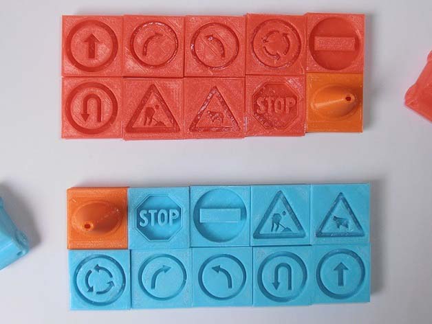 How I Designed This The traffic signs were originally downloaded as .svg files and modified with Inkscape to transform all the curves into lines. The files were saved as .dxf files and added to *.scad files. The code for the lego-compatible blocks was provided by our teacher during the course. The .scad files were exported as .stl files and the mesh were repaired with Netfabb Basic. To be able to print the pieces, the software Repetier-Host for Felix printers was used. Here are the original files: Traffic cone:http://www.thingiverse.com/thing: Car: http://www.thingiverse.com/thing:609957 Animals: https://thenounproject.com/panzano/collection/usa-traffic-signs/?oq=traffic%20signs&cidx=3&i=163023 Roadworks: https://thenounproject.com/aldricroib/collection/traffic-signs/?oq=traffic%20signs&cidx=2&i=240697 Round point: https://thenounproject.com/search/?q=traffic+signs&i=7538 Turn right | Turn left: https://thenounproject.com/adamzubin/collection/traffic-sign/?oq=traffic%20signs&cidx=0&i=131433 Straight ahead: https://thenounproject.com/AphoomZhah/collection/traffic-signs/?oq=traffic%20signs&cidx=1&i=180595 No entry: https://thenounproject.com/term/no-entry/10540/ Stop: https://thenounproject.com/panzano/collection/usa-traffic-signs/?oq=traffic%20signs&cidx=3&i=162744