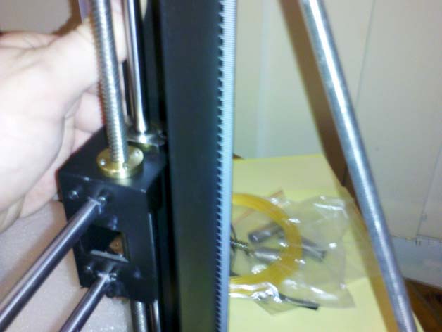 If you are having trouble inserting the rod: Move the printer so that the front feet are over the edge of your table/bench. That way the rod can be dropped lower than the level of the table, and easily lifted up through the hole in the top bracket. If you find your rod does not align to both holes, in the foot to the top bracket, your printer is bent! (Mine was too, "hello sailor", welcome to the club.)