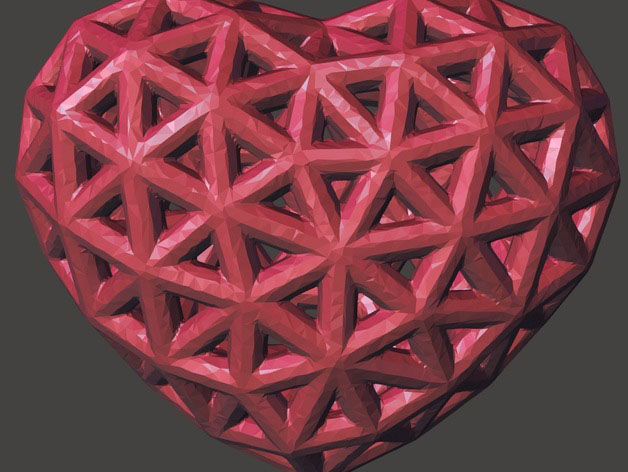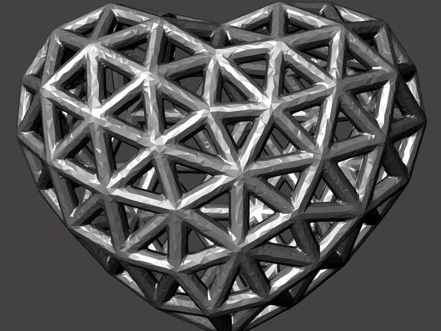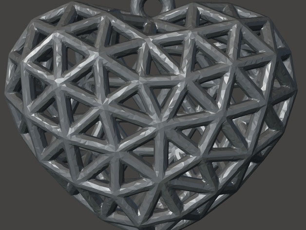 DOWNLOADSummary For the next two weeks, Thingiverse will be flooded with hearts. This is my contribution. I created a base heart shape and remeshed into a low poly version. I used the triangulation of the low poly version to create a wire-based model. The wire model can be used as a pendant by feeding a thread through the mesh structure. I also added a model with a small eye on top the heart.