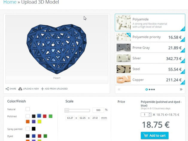I ordered it on i.materialise in polyamide polished blue. I will add a picture of the printed model when I get it.