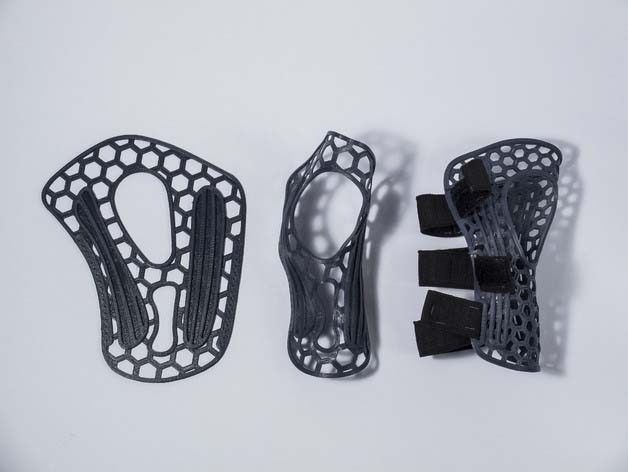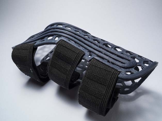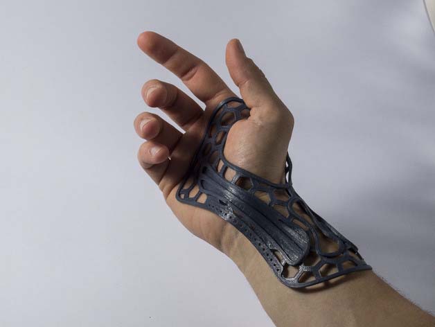 Summary PLA wrist brace, printed flat in open shape, next bended on the wrist of the patient after heating in hot water